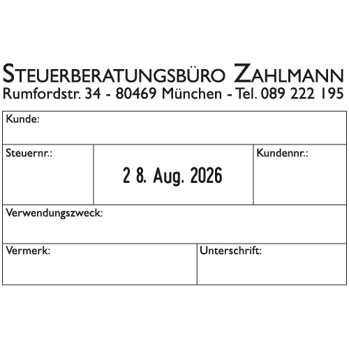 Er verfügt über eine 85 x 55 mm große Textplatte, die mit Text über und unter dem Datum gestaltet werden kann.