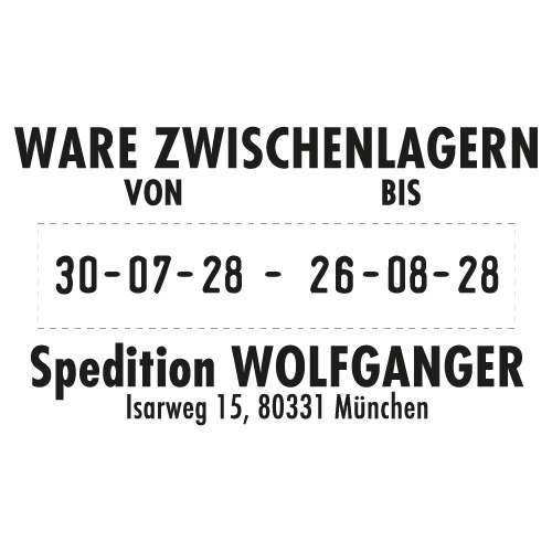 Er verfügt über eine 55 x 32 mm große Textplatte, die mit Text über und unter dem Datum gestaltet werden kann.